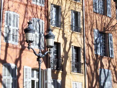 Photo de maisons, de volets, de fenêtres et d'un réverbère.